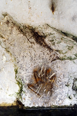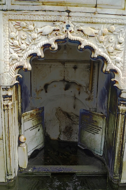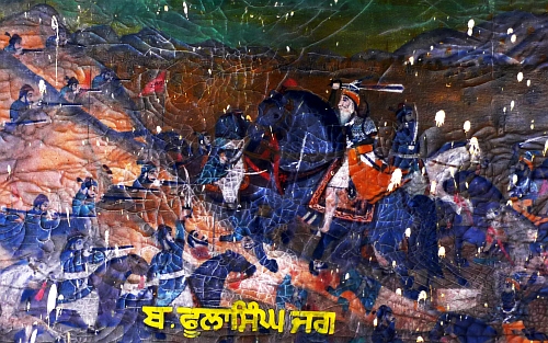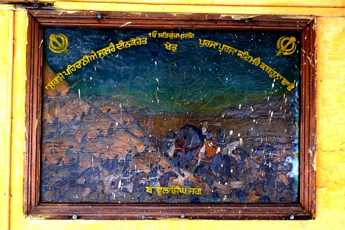 A damaged oil painting in the corridor of Panja Sahib Gurdwara showing Sikh army commander Phula Singh Akali (1761-1823). Signed: Hira Singh Jawaddi Ludhiana. 23. 8.1939. Photo No. 7. All other 'photos' 1 to 6 are missing. The painter could have done at least 10 oils. The Bhai – priest – of the gurdwara had no clue. |