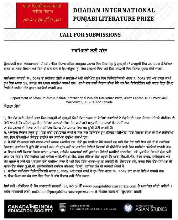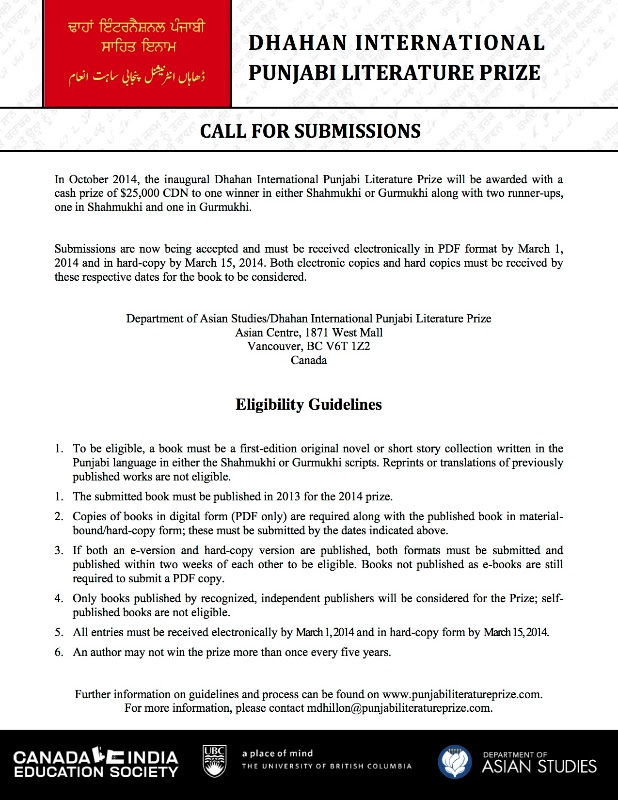 After successful launches in Vancouver, Chandigarh and Lahore, the Dhahan International Punjabi Literature Prize is now accepting submissions until March 1st in electronic and in hard copy by March 15th (further details available below). We look forward to receiving your submissions.