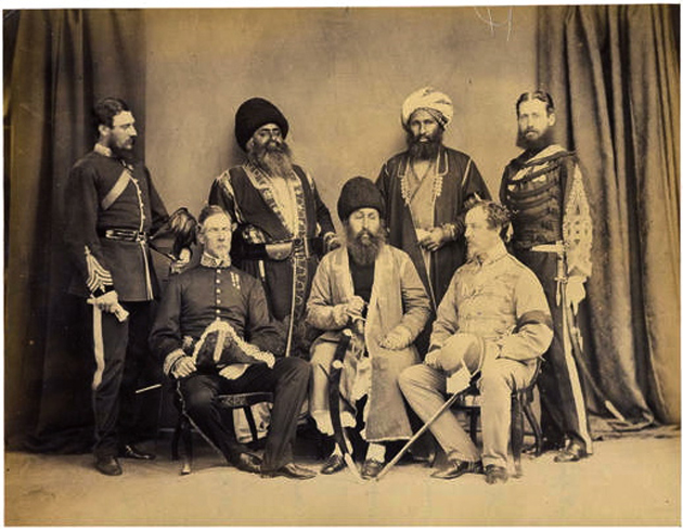 British Library identifies the people in the picture as (sitting L to R) Maj (later Maj Gen Sir) Frederick Richard Pollock (1827-99), Bengal Staff Corps, commissioner at Peshawar, Amir Sher Ali (1820-79), Lt Col Charles Francis Falcon Chamberlain (1826-70), Bombay Staff Corps, Cmdt of 23rd Bengal Native Infantry; (standing L-R) Sgt Major H W Bellew, interpreter, two individuals with headgear were unidentified, Capt (later Maj Gen)