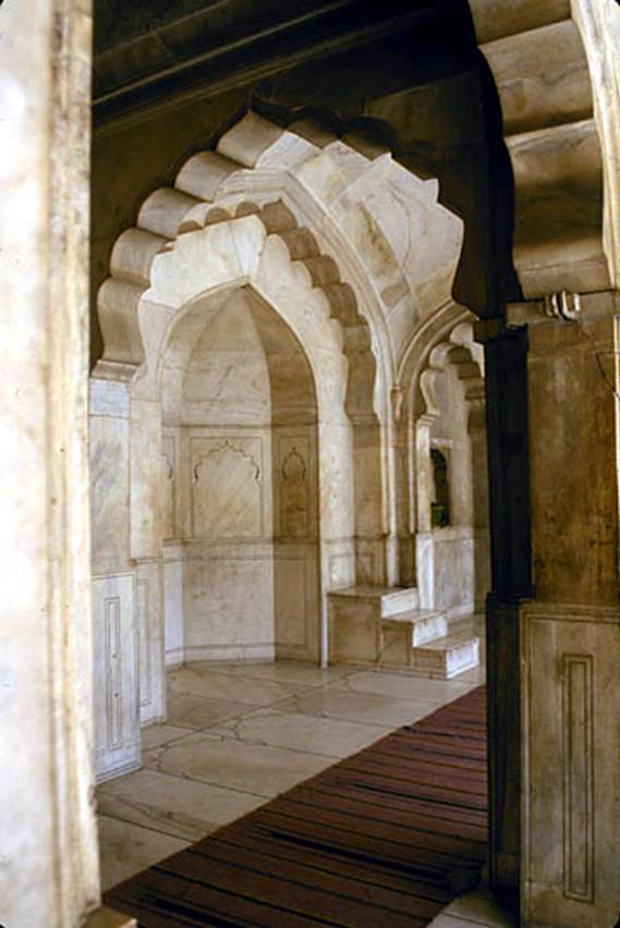 Moti Masjid (The Pearl Mosque) LahoreTariq Maqbool Moti Masjid is a well known historical mosque of Mughal era, located near the Alamgiri Gate, the main entrance to the Lahore fort on the western side. It is very close to other splendid structures of Lahore fort, ‘the Shish Mahal’ and ‘Naulakha Pavilion.’Moti in Urdu language means pearl and thus it means the Pearl mosque. It was customary among the Mughals to use generic names for the gemstones to name religious buildings. Other such examples are Mina Masjid (Gem Mosque) and Nagina Masjid (Jewel Mosque) in Agra fort. This mosque was built in the reign of emperor Nur-ud-Din Jahangir. The evidence comes from the following Persian inscription recorded over the arched entrance leading to the outer court- “In the twelfth year of the fortunate reign of His Imperial Majesty the shadow of God, like Solomon in dignity, Kyamurs in pomp, victorious in arms like Alexander, the Defender of the Faith, Shah Nur-ud-din Jahangir, son of Jalal-ud-din Akbar, the King, the Conqueror of the infidels, this noble edifice was completed in 1007 A.H (1598 A.D.) by the efforts of the humblest of disciples and the least of slaves, his devoted servant, Ma’amur Khan.”[1] This mosque served as a praying area for the Imperial harem. The court for worshippers measures fifty feet from north to south, and thirty three feet from east to west. The structure is simple, austere, and chaste with a touch of majesty. It is made of white marble brought from Makrana. The front of the mosque constitutes cusped arches supported by baluster columns with their smooth and fine contours. The mosque has three finely swollen domes, two aisles of five bays, and a slightly raised portal with a rectangular frame. The interior of the mosque is simple with the exception of the ceiling that is decorated and designed in four different orders, two curved and two trabeated. The floor of the mosque is of pure marble. The lustre of this white marbled structure proves a match for the lustre of the pearl.
