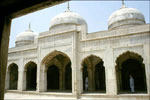 This mosque served as a praying area for the Imperial harem. The court for worshippers measures fifty feet from north to south, and thirty three feet from east to west. The structure is simple, austere, and chaste with a touch of majesty. It is made of white marble brought from Makrana. The front of the mosque constitutes cusped arches supported by baluster columns with their smooth and fine contours. The mosque has three finely swollen domes, two aisles of five bays, and a slightly raised portal with a rectangular frame. The interior of the mosque is simple with the exception of the ceiling that is decorated and designed in four different orders, two curved and two trabeated. The floor of the mosque is of pure marble. The lustre of this white marbled structure proves a match for the lustre of the pearl.
